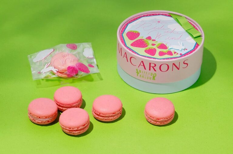 SHISEIDO PARLOUR Macaron Fraise: Beautifully packaged spring dessert featuring ganache fruit puree in baked dough with cream filling. Packaging inspired by vintage wrapping paper.